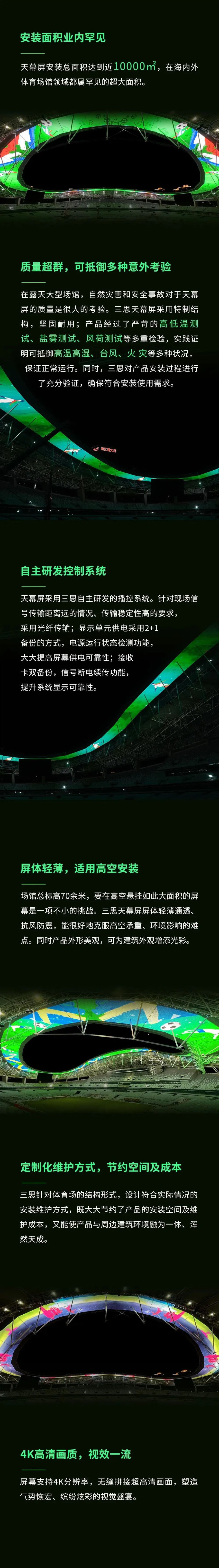 此次婷婷婷影院為上海(hǎi)體育場打造的10000㎡天幕屏,可謂(wèi)“巨無霸”級別。巨大的屏(píng)體沿建築輪廓而設計,每至夜幕降臨、屏幕亮起,其宛若(ruò)一條騰躍起舞的蛟龍,在場館上空遊走,與深邃天空相輝映,與綠茵草地同閃(shǎn)耀。