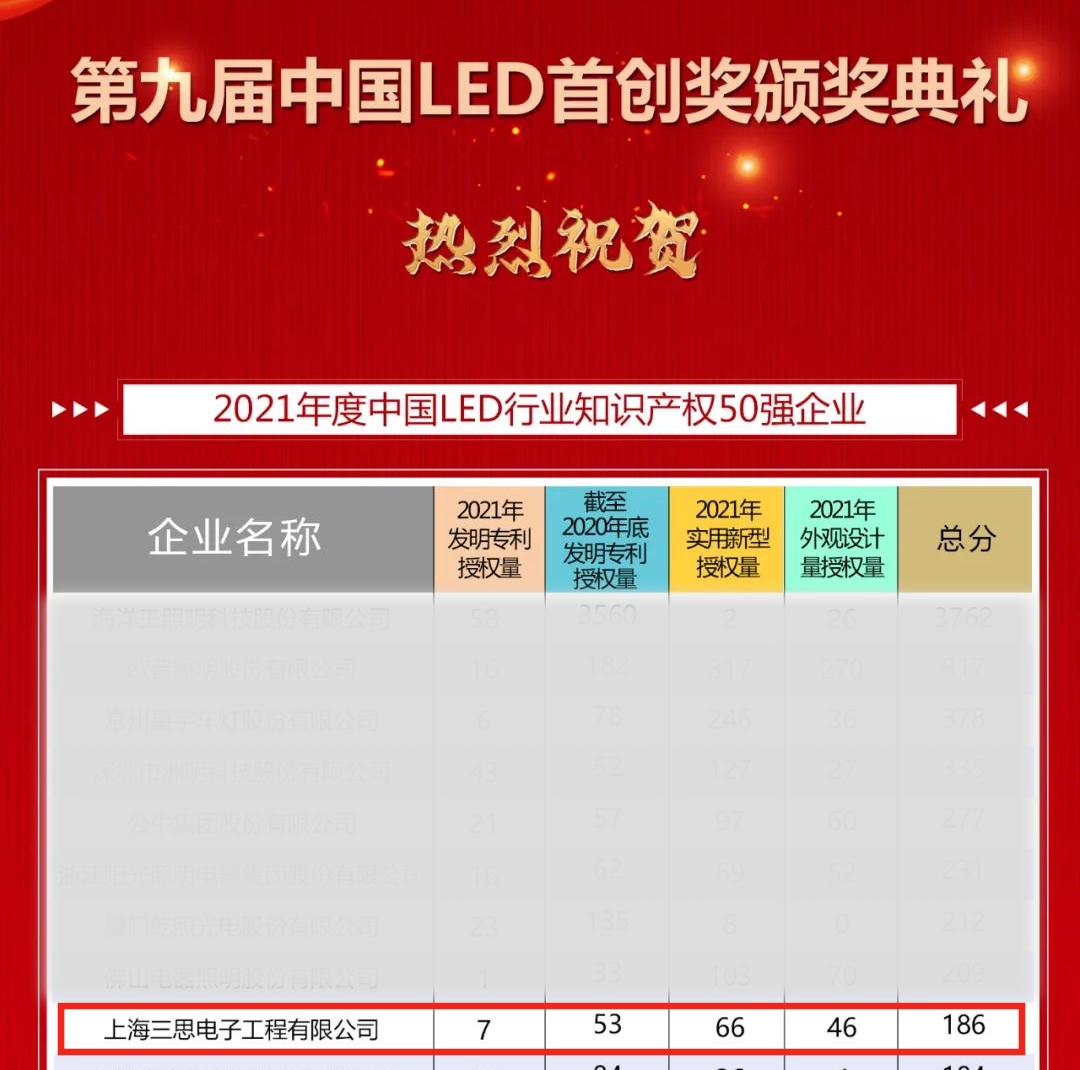 2022年8月(yuè)3日,第九(jiǔ)屆中(zhōng)國LED首創大會在(zài)廣州市廣交會展(zhǎn)館隆重舉行。大會上發布了(le)“第九屆中國LED首創獎2021年度中國LED行(háng)業營(yíng)收50強、知識產權50強榜單”,上海婷婷婷影院強勢入圍前十強,獲評“2021年度中國LED行業知識產權50強企業”稱(chēng)號。