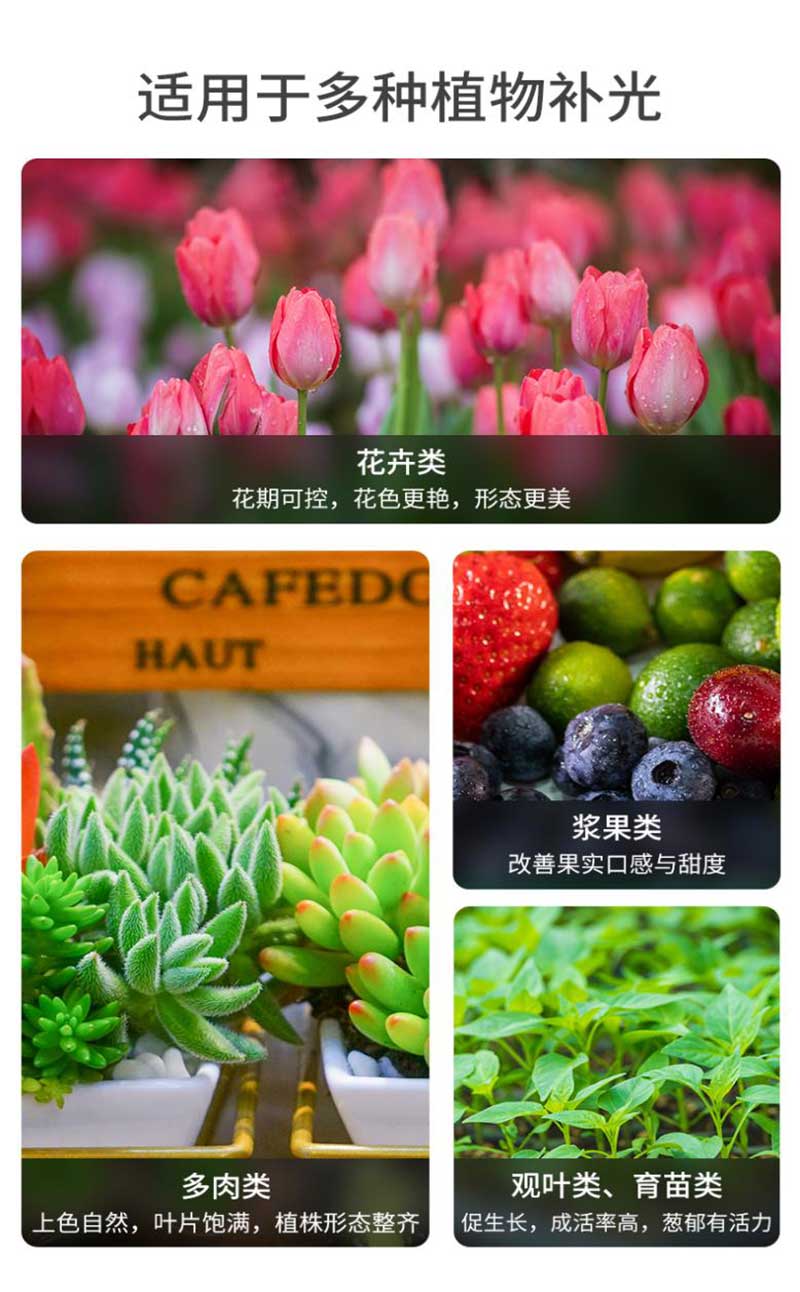 紅藍(lán)光譜植物生長燈光譜包含紅光光譜(pǔ)和藍光光譜,而全光譜植(zhí)物生長燈(dēng)則是模擬太陽光,光(guāng)譜接近太陽光,包含赤(chì)、橙、黃、綠、青、藍、紫不同光譜(pǔ),適用於多種植物補光,