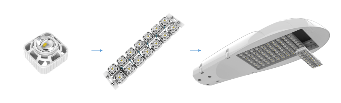 LED芯片自封(fēng)裝→單顆像素的光學設計,並成獨立發光體(獨立像(xiàng)素發光)→多顆像素組合成發光模組→根據應用(yòng)環境需求(qiú)配置不同功率的成品路燈頭。