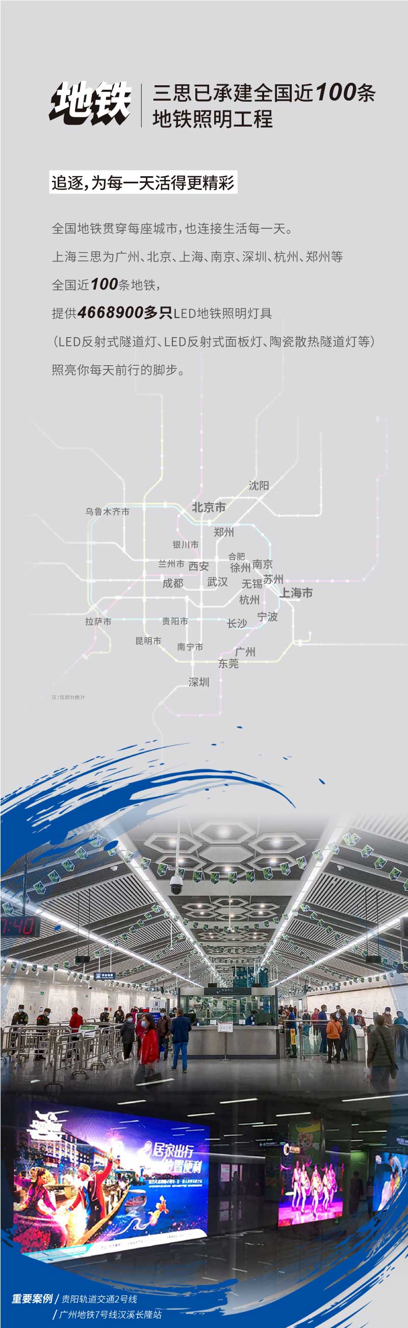 貴陽軌道交通2號線於2021年4月28日全線開通,全線總長41.5公裏,共32座(zuò)車站。其中,上海婷婷婷影院服務共完成了此項目一(yī)期12站(公共區和區間隧道)、二期4站(設備區)的照明設(shè)備供(gòng)應,共計LED燈具數量達30000套。