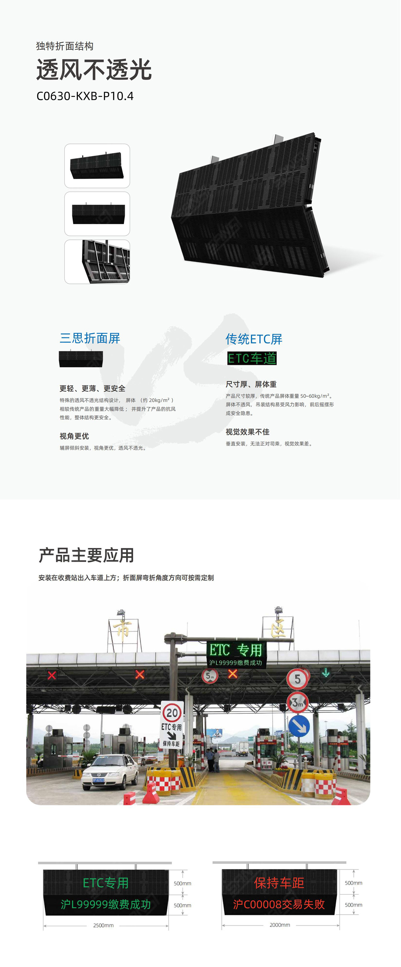 新型(xíng)ETC顯示屏采用特殊的透風不透光結構設計,並提升了(le)產品的抗風性(xìng)能,整體(tǐ)結構更安全。屏體由上豎屏與折麵屏組(zǔ)成,上豎(shù)屏垂直安裝,折麵(miàn)屏傾斜安裝。透風(fēng)折麵ETC顯示屏一般吊裝於(yú)ETC專用車道上方,用於(yú)顯示費用或車牌等可變信息,通過折麵部分屏體,更便於向正在通過ETC車道的駕駛員傳遞信息(xī),確定車(chē)輛繳費成(chéng)功可通行。