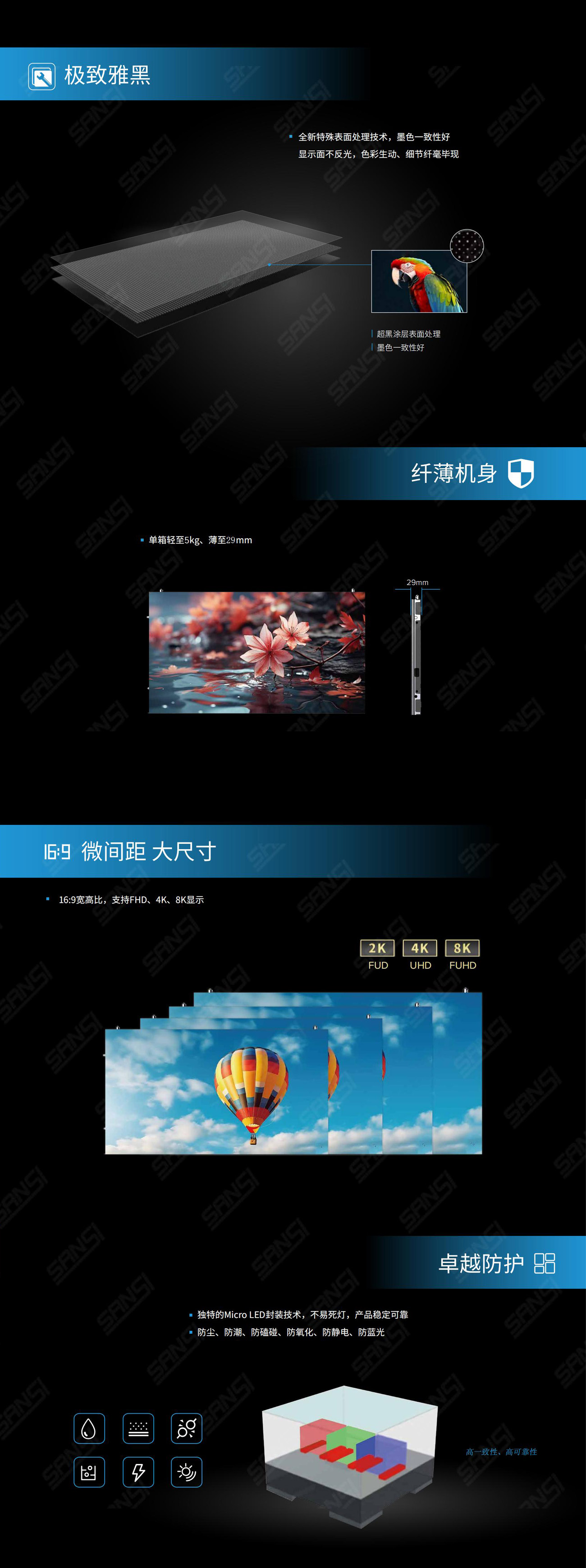 VEⅢ MCOB是一款優秀(xiù)的COB微間距顯示產品。16:9寬高比,600mm的機身寬度,具有卓越的顯示性(xìng)能。超高解析度,響應速度快,色域覆(fù)蓋廣。具有防水、防(fáng)潮、防塵(chén)、防氧化、防撞、方便(biàn)清潔等特點,十分適合博物館、展覽展示、高端展廳等需要逼真圖像的專業領域。