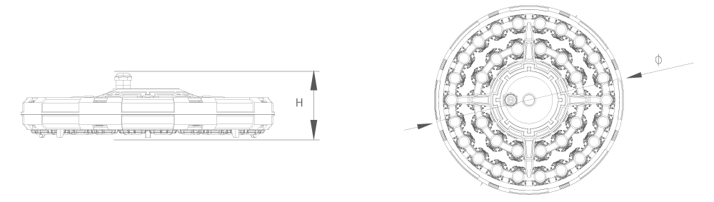 C2300-CE-200W 176 ~ 264 VAC 50/60Hz ≥ 80 30º/60º/90º/120º PC + 陶(táo)瓷像素(sù) 掛(guà)鉤 / 吊(diào)杆 / 吊鏈 常亮/DALI/0-10V Φ370*H78.5mm 約3.18KG