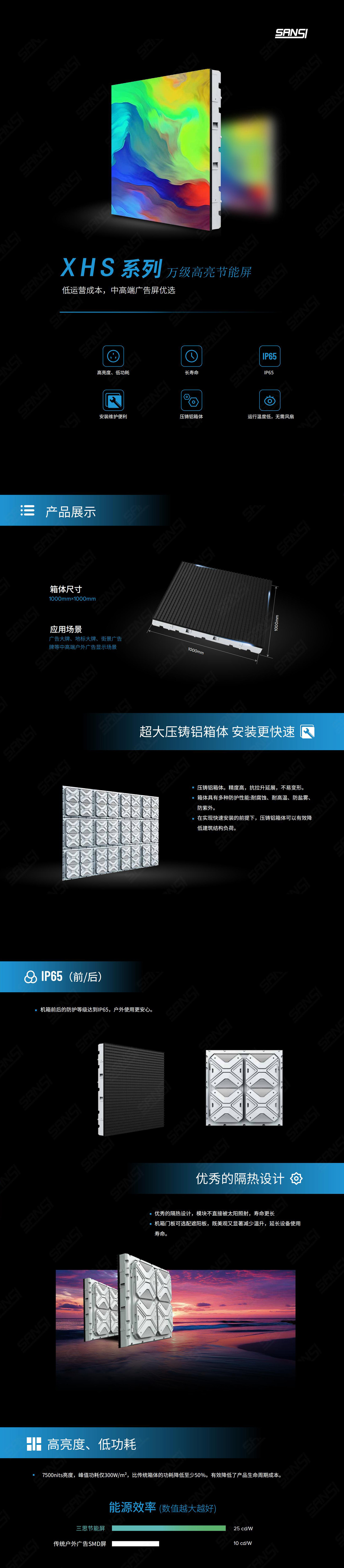 XHS是一款低運營成本、高亮節(jiē)能(néng)的LED戶外節能屏,出色的(de)能源效率使其比傳統戶外屏(píng)節能50%以上。可靠穩定的顯示品質、更長的使用壽命勝任中高端(duān)戶外廣告顯示多重場景需求。